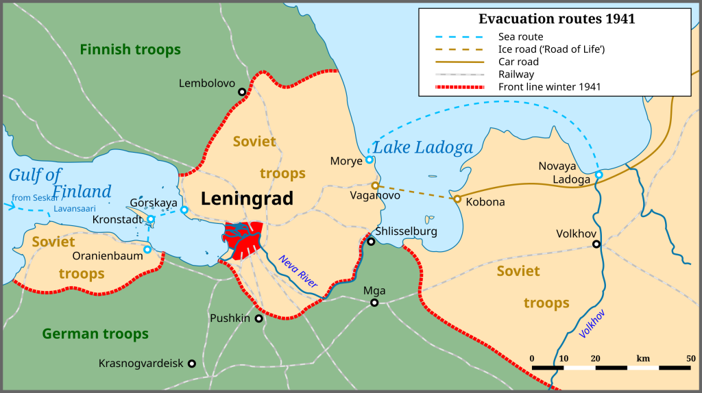 - Leningrad: The “Road of Life” across Lake Ladoga.