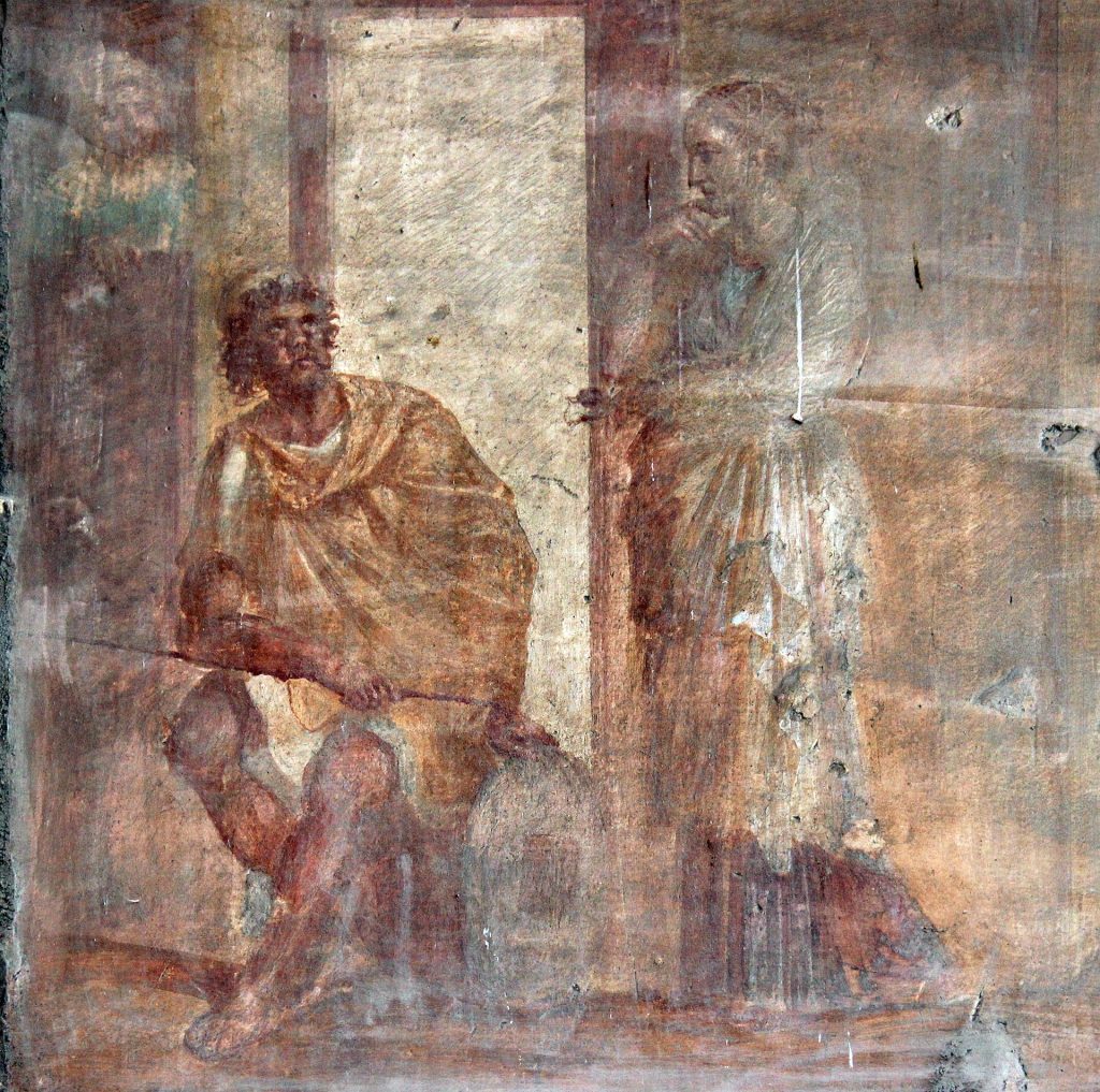 Penelope encounters the returned Odysseus posing as a beggar. From a mural in the Macellum of Pompeii
